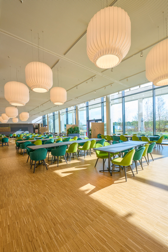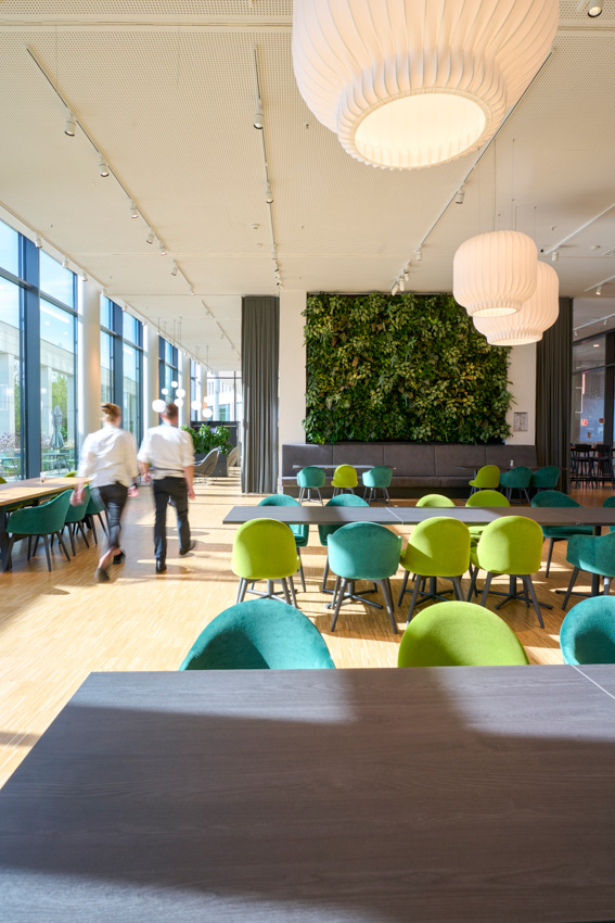 im deutlichen Kontrast zur Innenarchitektur der Office-Flächen. Leuchten wie Lampions, Pflanzwände und Blumenkübel, ein Boden aus Eichenholz und samtige, grüne Bezüge der Sitzmöbel laden die Mitarbeiter ein, sich hier wirklich wohl zu fühlen und gesund und Lecker zu essen.