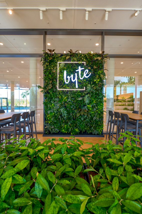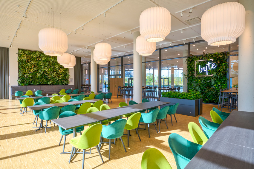Hier spielen Betriebsrestaurant und Bistro „Bit & Byte“ eine große Rolle. Unsere Auftraggeber wünschten sich einen Ort der Kommunikation und Entspannung , an dem die Mitarbeiter wirklich auftanken können. Sie sollten sich fühlen wie bei einem Picknick im Grünen.